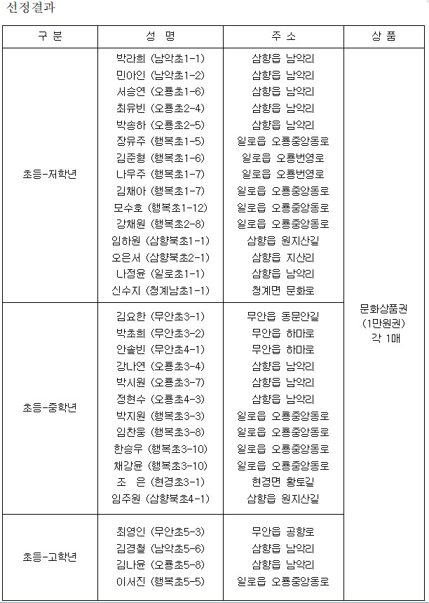 도서관 행사 home 도서관 행사 독서퀴즈 독서퀴즈 독서문화행사독서퀴즈행사일정도서관 갤러리 독서퀴즈 2023년 5월 독서퀴즈 당첨자 안내 조회수 : 11 1. 상품은 직접 수령하시거나 등기발송해 드립니다.2. 문의사항은 061-450-5465로 연락주세요. 목록