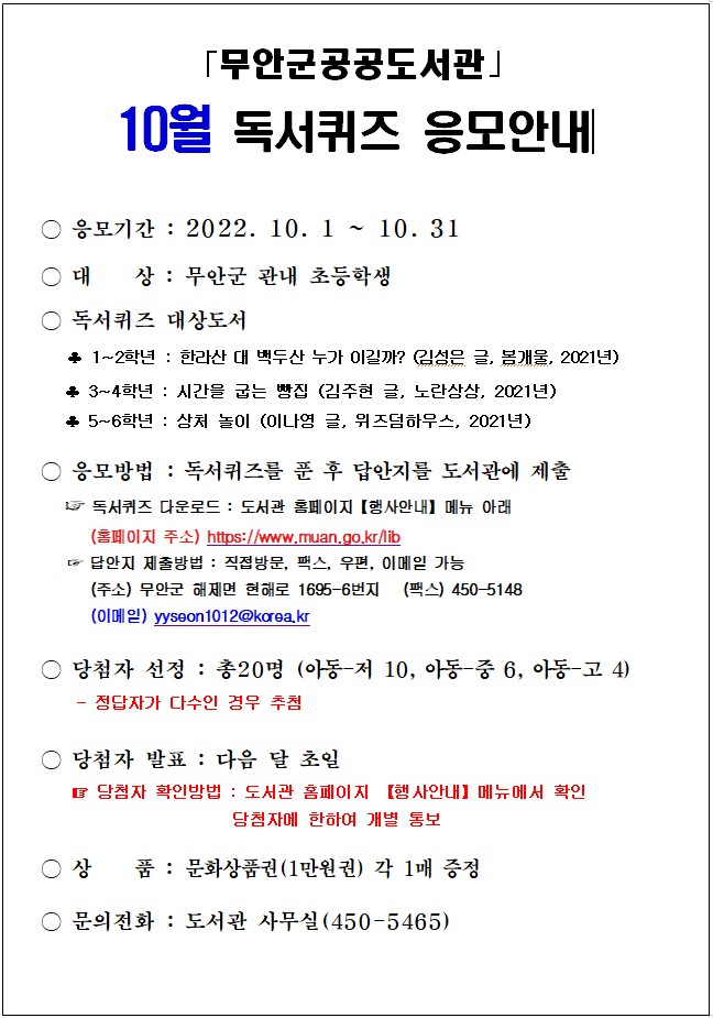 2022년 10월 초등학생 독서퀴즈 응모안내