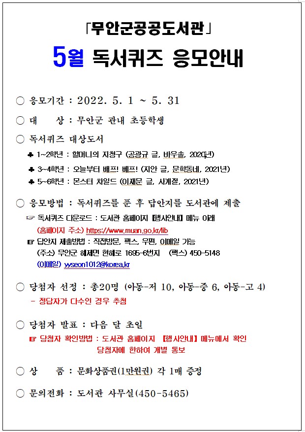 2022년 5월 초등학생 독서퀴즈 응모안내