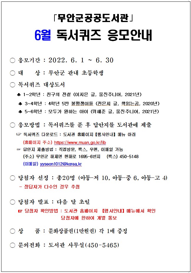 2022년 6월 초등학생 독서퀴즈 응모안내