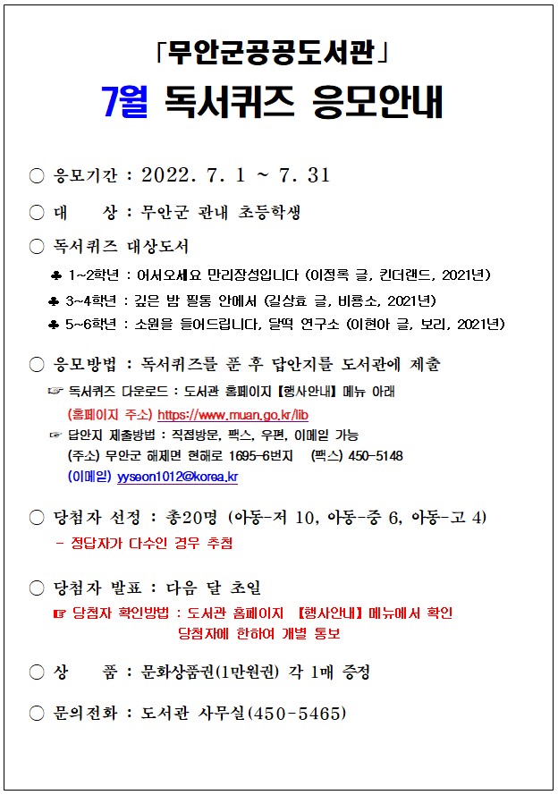 2022년 7월 초등학생 독서퀴즈 응모안내