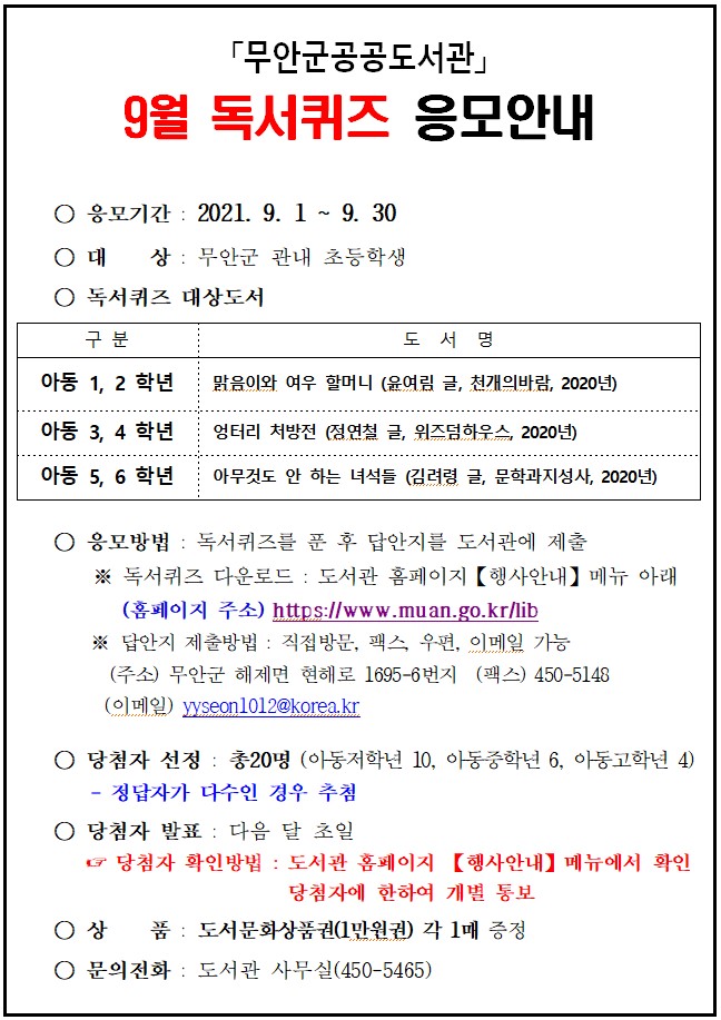 2021년 9월 초등학생 독서퀴즈 응모안내