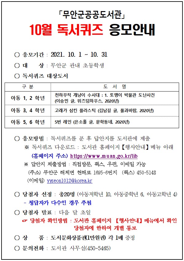 2021년 10월 초등학생 독서퀴즈 응모안내