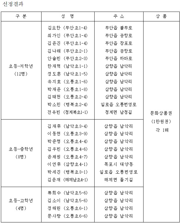 도서관 행사 home 도서관 행사 독서퀴즈 독서퀴즈 독서문화행사독서퀴즈행사일정도서관 갤러리 독서퀴즈 2021년 10월 독서퀴즈 당첨자 안내 조회수 : 11 1. 상품은 직접 수령하시거나 등기발송해 드립니다.2. 문의사항은 061-450-5465로 연락주세요.3. 2021년 10월 독서퀴즈 답안지는 첨부파일을 확인하세요. 목록