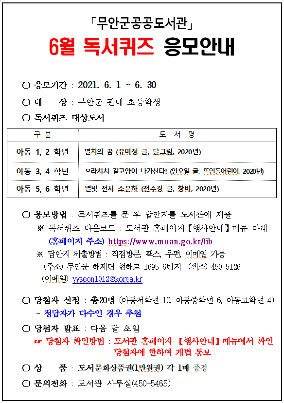 2021년 6월 초등학생 독서퀴즈 응모안내