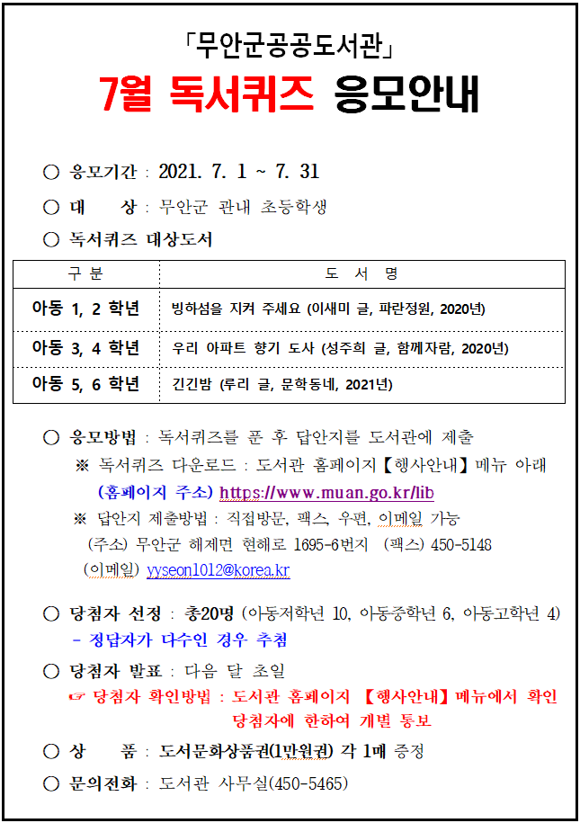 2021년 7월 초등학생 독서퀴즈 응모안내