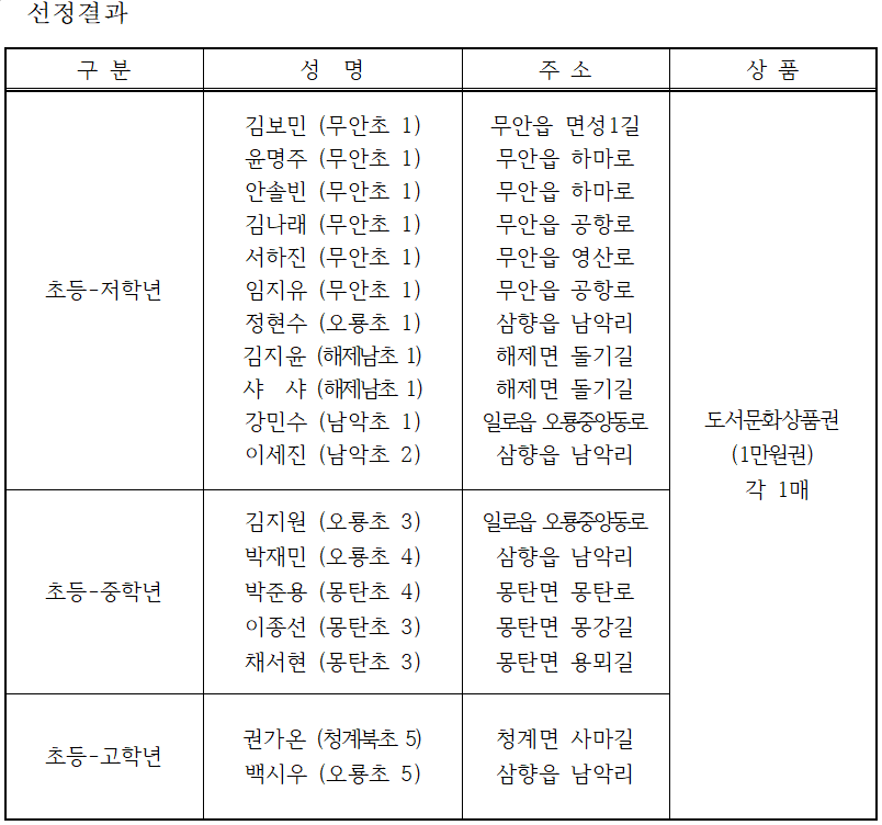 도서관 행사 home 도서관 행사 독서퀴즈 독서퀴즈 독서문화행사독서퀴즈행사일정도서관 갤러리 독서퀴즈 2020년 10월 독서퀴즈 당첨자 안내 조회수 : 11 1. 상품은 직접 수령하시거나 등기발송해 드립니다.2. 문의사항은 061-450-5465로 연락주세요.3. 2020년 10월 독서퀴즈 답안지는 첨부파일을 확인하세요. 목록