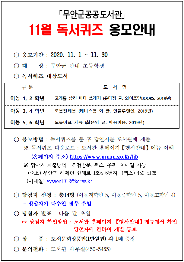 2020년 11월 초등학생 독서퀴즈 응모안내