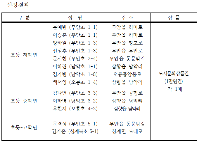 도서관 행사 home 도서관 행사 독서퀴즈 독서퀴즈 독서문화행사독서퀴즈행사일정도서관 갤러리 독서퀴즈 2020년 12월 독서퀴즈 당첨자 안내 조회수 : 11 1. 상품은 직접 수령하시거나 등기발송해 드립니다.2. 문의사항은 061-450-5465로 연락주세요.3. 2020년 12월 독서퀴즈 답안지는 첨부파일을 확인하세요. 목록
