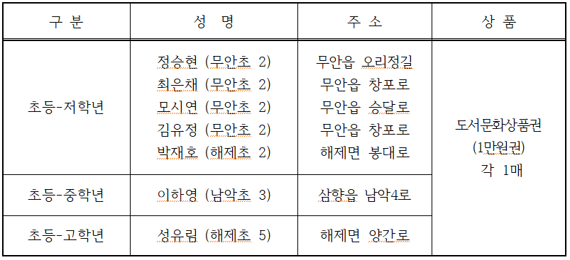 도서관 행사 home 도서관 행사 독서퀴즈 독서퀴즈 독서문화행사독서퀴즈행사일정도서관 갤러리 독서퀴즈 2020년 4월 독서퀴즈 당첨자 안내 조회수 : 11 1. 상품은 직접 수령하시거나 등기발송해 드립니다.2. 문의사항은 061-450-5465로 연락주세요.3. 2020년 4월 독서퀴즈 답안지는 첨부파일을 확인하세요. 목록