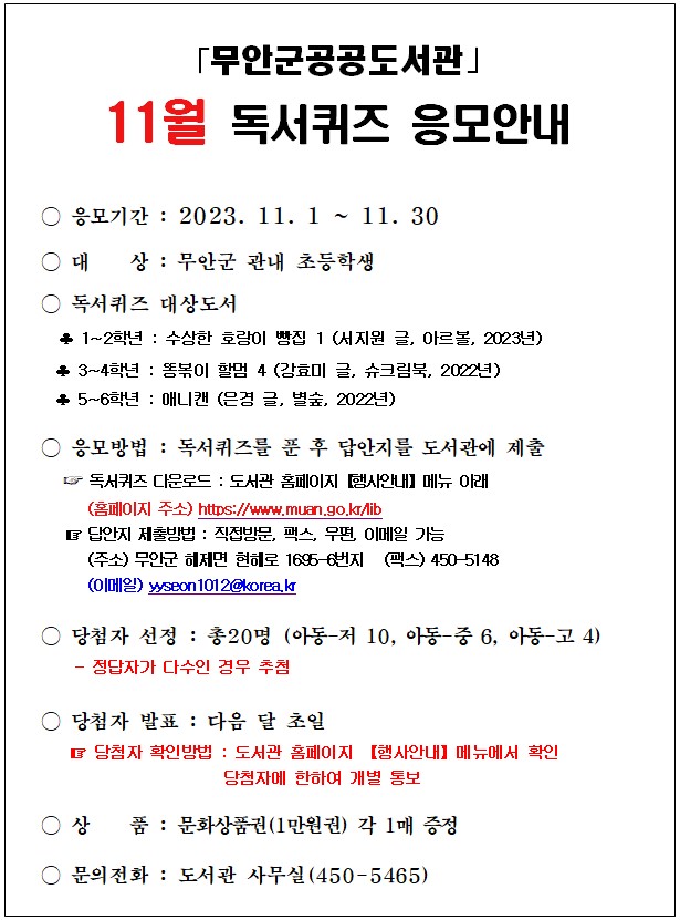 2023년 11월 초등학생 독서퀴즈 응모안내