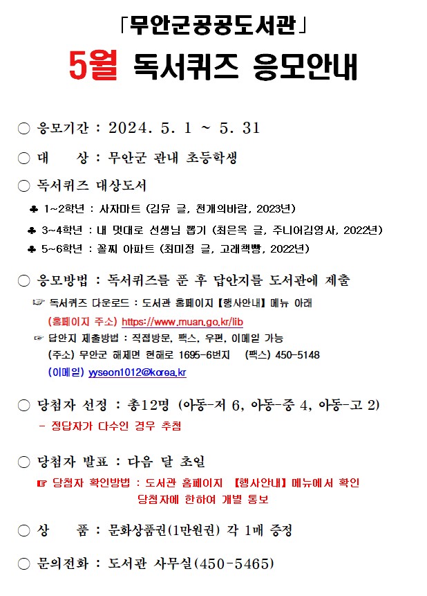 2024년 5월 초등학생 독서퀴즈 응모안내